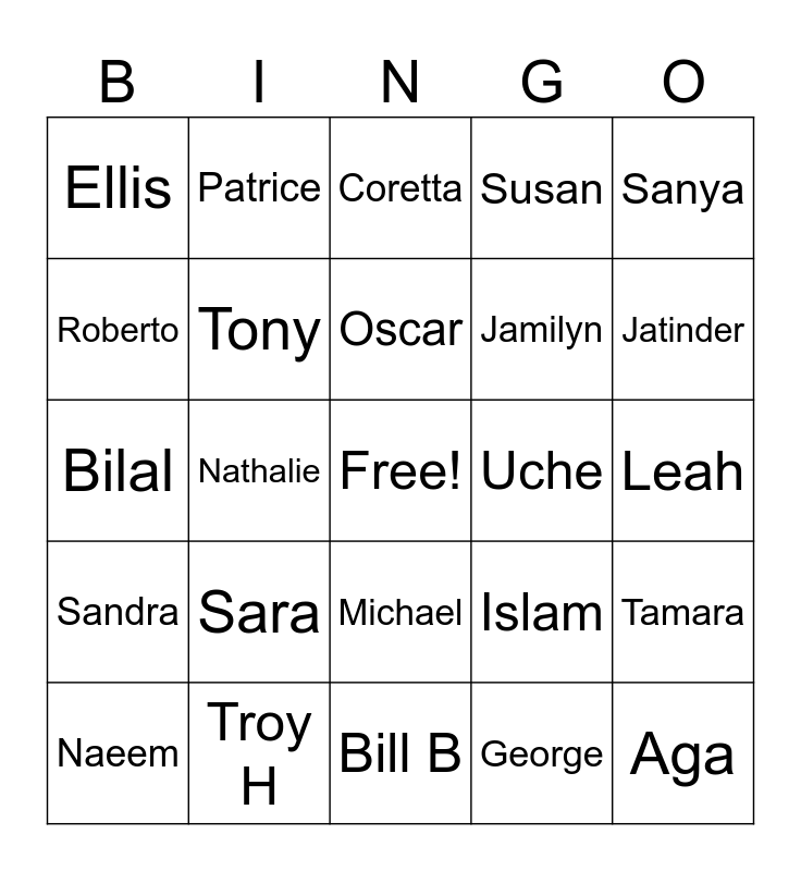 This bingo card has a free space and 28 words: Tamara, Joe, Jamilyn, George, Roberto, Coretta, Patrice, Sandra, Uche, Naeem, Bilal, Susan, Troy H, Bill B, Jatinder, Richard, Sara, Tony, Oscar, Michael, Ellis, Steve, Aga, Nathalie, Leah, Islam, Sanya and Grace.