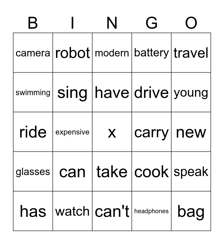 This bingo card has a free space and 25 words: can, can't, have, has, travel, camera, swimming, robot, carry, take, drive, ride, cook, speak, sing, old, new, modern, young, expensive, bag, watch, glasses, battery and headphones.