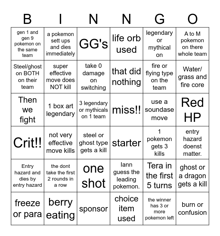 This bingo card has 36 words: Iann guess the leading pokemon., one shot, choice item used, Steel/ghost on BOTH on their team, Crit!!, miss!!, super effective move does NOT kill, sponsor, legendary or mythical on, Tera in the first 5 turns, Water/ grass and fire core, life orb used, ghost or a dragon gets a kill, 1 box art legendary, that did nothing, gen 1 and gen 9 pokemon on the same team, Entry hazard and dies by entry hazard, use a soundase move, Then we fight, GG's, 3 legendary or mythicals on 1 team, not very effective move kills, starter, steel or ghost type gets a kill, 1 pokemon gets 3 kills, a pokemon sett ups and dies immediately, fire or flying type on the team, berry eating, take 0 damage on switching, A to M pokemon on there whole team, burn or confusion, freeze or para, entry hazard doenst matter., Red HP, the dont take the first 2 rounds in a row and the winner has 3 or more pokemon left.