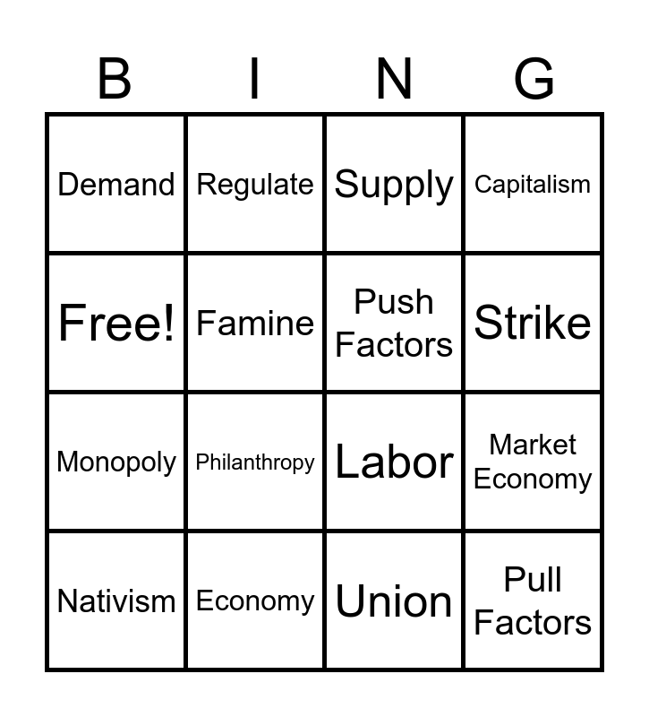 This bingo card has 16 words: Economy, Market Economy, Supply, Demand, Monopoly, Regulate, Labor, Union, Free!, Famine, Nativism, Capitalism, Philanthropy, Strike, Push Factors and Pull Factors.