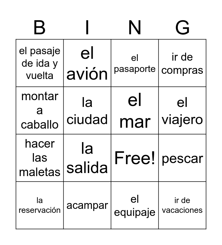 This bingo card has 21 words: acampar, el aeropuerto, el avión, el campo, el equipaje, el mar, el pasaje de ida y vuelta, el pasaporte, Free!, el viajero, hacer las maletas, ir de compras, ir de vacaciones, la aduana, la ciudad, la playa, la reservación, la salida, montar a caballo, pescar and sacar/tomar fotos.