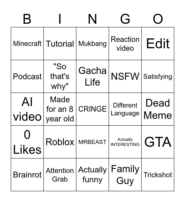 This bingo card has a free space and 24 words: Brainrot, Roblox, Gacha Life, Family Guy, Edit, Minecraft, Tutorial, Mukbang, Different Language, Dead Meme, AI video, "So that's why", Actually INTERESTING, GTA, Podcast, Attention Grab, Actually funny, Reaction video, Satisfying, 0 Likes, Made for an 8 year old, MRBEAST, NSFW and Trickshot.
