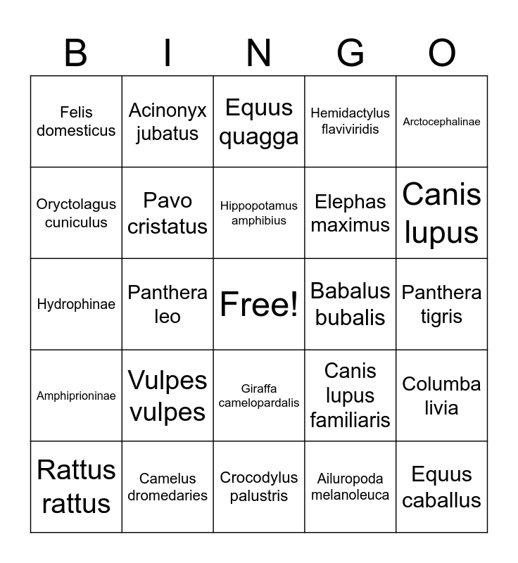 This bingo card has a free space and 24 words: Vulpes vulpes, Camelus dromedaries, Hippopotamus amphibius, Rattus rattus, Arctocephalinae, Felis domesticus, Oryctolagus cuniculus, Acinonyx jubatus, Babalus bubalis, Giraffa camelopardalis, Elephas maximus, Hydrophinae, Canis lupus familiaris, Columba livia, Pavo cristatus, Ailuropoda melanoleuca, Panthera tigris, Equus quagga, Canis lupus, Panthera leo, Equus caballus, Amphiprioninae, Hemidactylus flaviviridis and Crocodylus palustris.