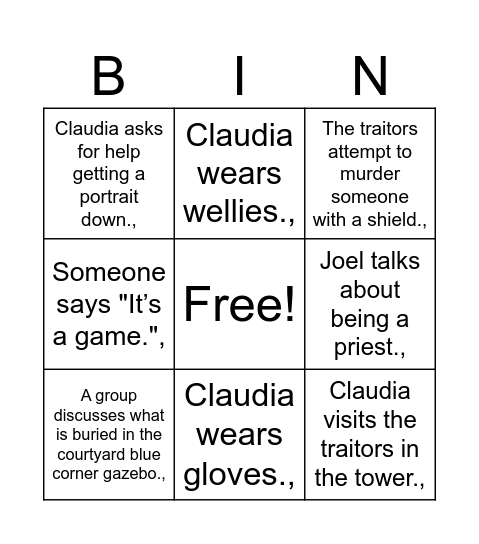 This bingo card has a free space and 43 words: Someone walks into a discussion about themselves.,, Alexander talks about being a diplomat.,, Linda is voted as a traitor at the roundtable.,, Joe accuses Linda of being a traitor.,, Linda denies being a traitor.,, Leanne/Ioan/Livi deny voting for each other at the roundtable.,, The traitors attempt to murder someone with a shield.,, The traitors choose to murder.,, Claudia visits the traitors in the tower.,, Someone says "It’s not personal.",, Someone says "It’s a game.",, Someone says "I love you all.",, Person murdered says they are too much of a threat.,, Someone mentions a bad night’s sleep.,, Someone has a party at breakfast.,, At one roundtable someone says "I really hope I’m wrong.",, Someone spells a name wrong at the roundtable.,, Someone says "100% faithful.",, Linda looks when someone says "traitor.",, Someone cries.,, Claudia wears wellies.,, Someone listens at a door.,, Meryl says she loves murdering.,, Claudia asks for help getting a portrait down.,, Leanne talks about being in the army.,, Someone gets a shield.,, Banish a faithful.,, Banish a traitor.,, Meryl and/or Linda mention the sisterhood.,, Linda says nothing proactive at the roundtable.,, Dan accuses a faithful of being a traitor.,, The traitors choose to seduce.,, ________ is banished. (Your choice),, At the roundtable someone says "I hope I’m right.",, Upside-down slate.,, Someone is accused of being different from the start of the show.,, Meryl cries at the roundtable.,, Claudia wears gloves.,, Joel talks about being a priest.,, Leon describes himself as humble and a family man.,, Anna wears a big statement.,, A group discusses what is buried in the courtyard blue corner gazebo., and ________ is murdered. (Your choice),.