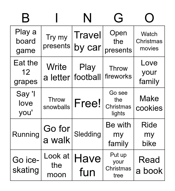 This bingo card has a free space and 29 words: Go ice-skating, Play ice-hockey, Throw snowballs, Build a snowman, Play a board game, Travel by car, Write a letter, Go for a walk, Go see the Christmas lights, Look at the moon, Make cookies, Read a book, Have fun, Put up your Christmas tree, Love your family, Dig a whole, Sledding, Running, Watch Christmas movies, Say 'I love you', Be with my family, Play with my cousins, Throw fireworks, Eat the 12 grapes, Open the presents, Try my presents, Ride my bike, Play football and Play basketball.