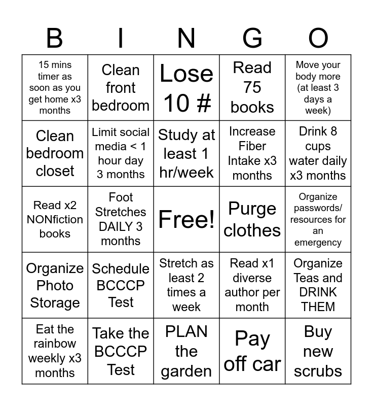 This bingo card has a free space and 24 words: Schedule BCCCP Test, Take the BCCCP Test, Study at least 1 hr/week, Eat the rainbow weekly x3 months, Move your body more (at least 3 days a week), 15 mins timer as soon as you get home x3 months, Clean bedroom closet, Clean front bedroom, Purge clothes, Stretch as least 2 times a week, Increase Fiber Intake x3 months, Read x2 NONfiction books, Read x1 diverse author per month, Organize Teas and DRINK THEM, Limit social media < 1 hour day 3 months, Pay off car, Organize passwords/ resources for an emergency, Lose 10 #, Drink 8 cups water daily x3 months, Foot Stretches DAILY 3 months, Buy new scrubs, Organize Photo Storage, Read 75 books and PLAN the garden.