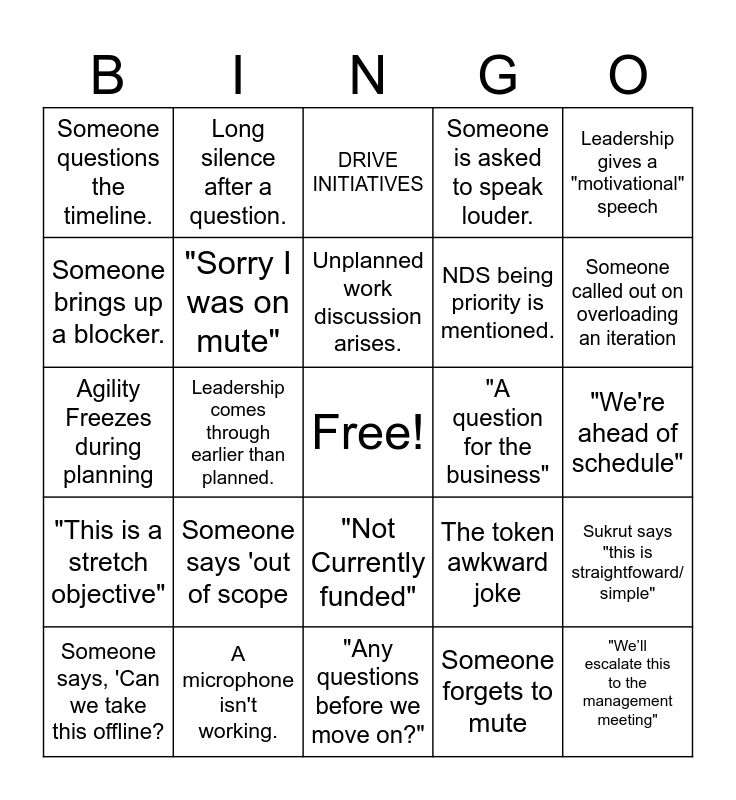 This bingo card has a free space and 24 words: Someone says 'out of scope, A microphone isn't working., Unplanned work discussion arises., Someone says, 'Can we take this offline?, Leadership gives a "motivational" speech, Someone questions the timeline., Someone brings up a blocker., Long silence after a question., "A question for the business", "Not Currently funded", NDS being priority is mentioned., Agility Freezes during planning, The token awkward joke, Sukrut says "this is straightfoward/ simple", "Sorry I was on mute", Someone forgets to mute, "We're ahead of schedule", DRIVE INITIATIVES, Someone called out on overloading an iteration, Leadership comes through earlier than planned., "We’ll escalate this to the management meeting", "This is a stretch objective", Someone is asked to speak louder. and "Any questions before we move on?".