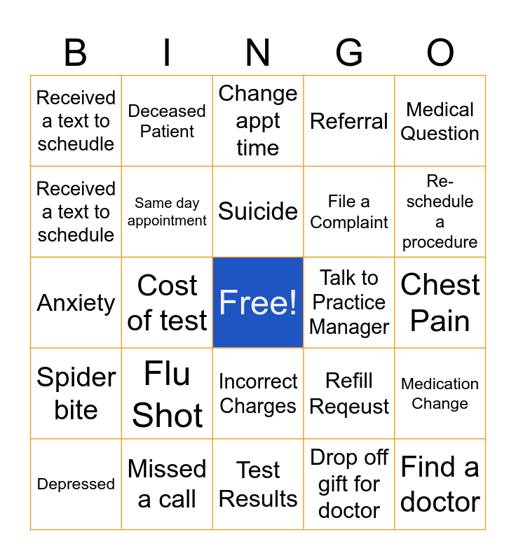 This bingo card has a free space and 29 words: Depressed, Breathing test, Cost of test, Physical, Received a text to scheudle, Change appt time, Same day appointment, Flu Shot, Talk to Practice Manager, Missed a call, Chest Pain, Find a doctor, Test Results, Drop off gift for doctor, Re-schedule a procedure, Confirm instructions, Incorrect Charges, Spider bite, Medical Question, Anxiety, Refill Reqeust, Schedule an appointment, File a Complaint, Received a text to schedule, Referral, Deceased Patient, Medication Change, Suicide and Critical Lab.