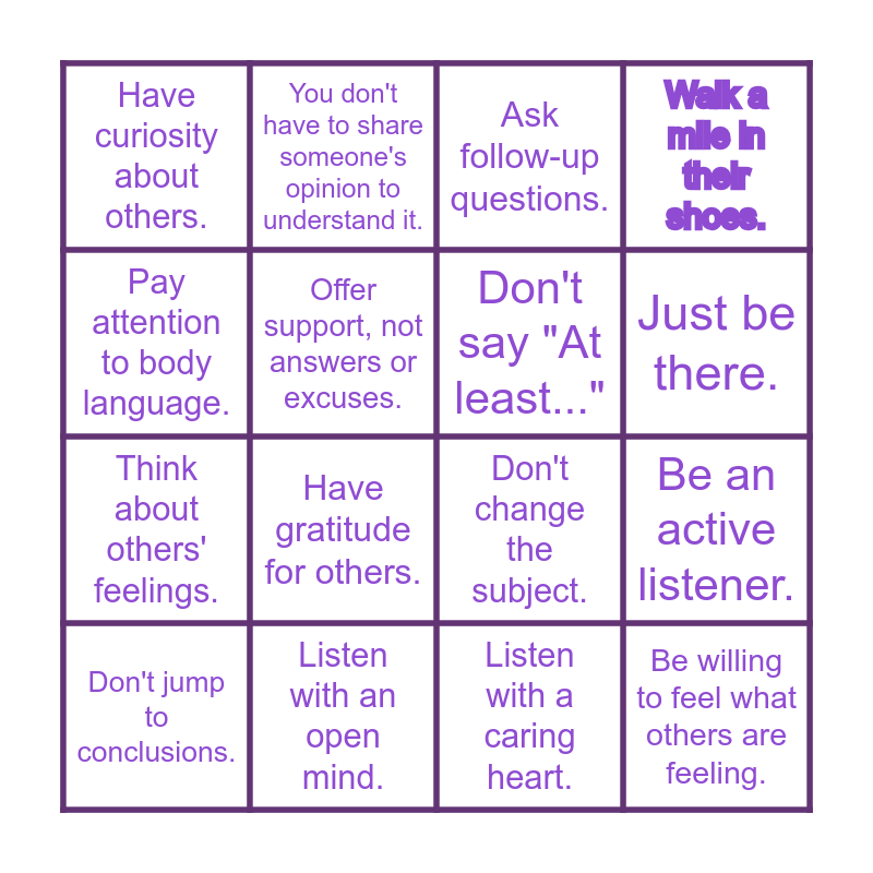 This bingo card has 16 words: Listen with an open mind., Be an active listener., Ask follow-up questions., Have curiosity about others., Think about others' feelings., You don't have to share someone's opinion to understand it., Don't change the subject., Listen with a caring heart., Pay attention to body language., Offer support, not answers or excuses., Don't jump to conclusions., Walk a mile in their shoes., Have gratitude for others., Just be there., Don't say "At least..." and Be willing to feel what others are feeling..