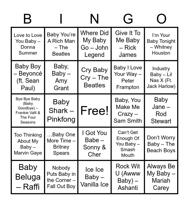 This bingo card has a free space and 52 words: Cry Baby – Janis Joplin, Always Be My Baby – Mariah Carey, Come On Over Baby – Christina Aguilera, Ice Ice Baby – Vanilla Ice, …Baby One More Time – Britney Spears, Baby – Justin Bieber & Ludacris, Baby You’re A Rich Man – The Beatles, Baby Got Back – Sir Mix-A-Lot, Baby Boy – Beyoncé (ft. Sean Paul), Baby Love – The Supremes, Baby, Baby – Amy Grant, Baby, It’s You – The Shirelles, Don’t Worry Baby – The Beach Boys, Can’t Get Enough Of You Baby – Smash Mouth, Missing My Baby – Selena, Baby Come Back – Player, Cry Baby Cry – The Beatles, Baby, You Make Me Crazy – Sam Smith, Cry Baby – Demi Lovato, I’m Your Baby Tonight – Whitney Houston, Baby Shark – Pinkfong, Rock Wit U (Awww Baby) – Ashanti, Love to Love You Baby – Donna Summer, Baby I Love Your Way – Peter Frampton, Baby I Need Your Loving – The Four Tops, Baby I – Ariana Grande, Anybody Seen My Baby – Rolling Stones, Hey Baby – No Doubt, Industry Baby – Lil Nas X (Ft. Jack Harlow), Baby Be Mine – Michael Jackson, Baby-Baby-Baby – TLC, Give It To Me Baby – Rick James, There Goes My Baby – Usher, Runaway Baby – Bruno Mars, Hey Baby (Drop It To the Floor) – Pitbull ft. T-Pain, Where Did My Baby Go – John Legend, Nobody Puts Baby in the Corner – Fall Out Boy, I Can’t Quit You Baby – Led Zeppelin, Pass The Baby – Jimmy Eat World, Baby – LL Cool J, You’re Having My Baby – Paul Anka, Baby Jane – Rod Stewart, Too Thinking About My Baby – Marvin Gaye, Be My Baby – The Ronettes, I Got You Babe – Sonny & Cher, B-A-B-Y – Carla Thomas, Baby, What A Big Surprise – Chicago, Bye Bye Baby (Baby Goodbye) – Frankie Valli & The Four Seasons, Pretty Baby – Vanessa Carlton, One For My Baby (And One More For the Road) – Frank Sinatra, Baby Beluga – Raffi and Baby Can I Hold You – Tracy Chapman.
