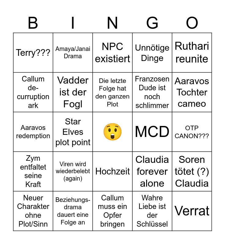 This bingo card has a free space and 24 words: Viren wird wiederbelebt (again), Beziehungs-drama dauert eine Folge an, Die letzte Folge hat den ganzen Plot, Neuer Charakter ohne Plot/Sinn, Ruthari reunite, Terry???, Callum de-curruption ark, Amaya/Janai Drama, MCD, Hochzeit, Franzosen Dude ist noch schlimmer, Aaravos redemption, Claudia forever alone, Soren tötet (?) Claudia, Vadder ist der Fogl, Wahre Liebe ist der Schlüssel, OTP CANON???, NPC existiert, Aaravos Tochter cameo, Star Elves plot point, Verrat, Zym entfaltet seine Kraft, Unnötige Dinge and Callum muss ein Opfer bringen.