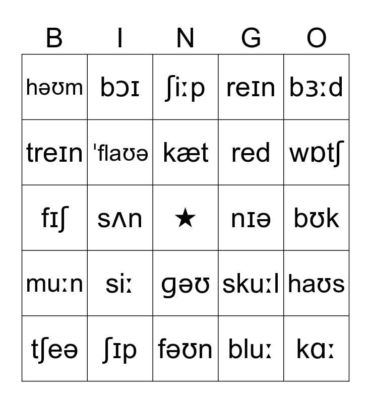 This bingo card has a free space and 24 words: siː, ʃɪp, kæt, tʃeə, bɜːd, həʊm, treɪn, bɔɪ, nɪə, ɡəʊ, red, fɪʃ, skuːl, haʊs, ˈflaʊə, bluː, bʊk, ʃiːp, wɒtʃ, sʌn, kɑː, muːn, reɪn and fəʊn.