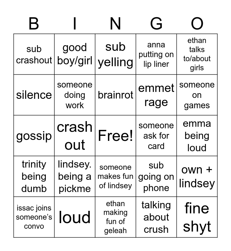 This bingo card has a free space and 24 words: lindsey. being a pickme, loud, brainrot, issac joins someone’s convo, ethan talks to/about girls, sub crashout, silence, good boy/girl, someone ask for card, someone makes fun of lindsey, emmet rage, gossip, sub going on phone, own + lindsey, someone doing work, talking about crush, emma being loud, sub yelling, someone on games, crash out, fine shyt, trinity being dumb, anna putting on lip liner and ethan making fun of geleah.