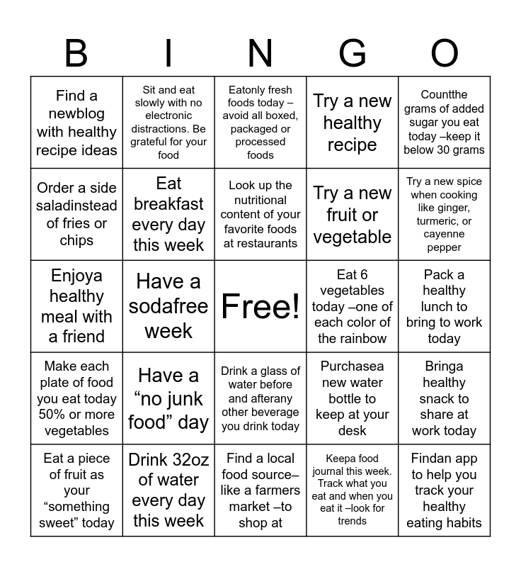 This bingo card has a free space and 24 words: Have a “no junk food” day, Drink 32oz of water every day this week, Look up the nutritional content of your favorite foods at restaurants, Eat a piece of fruit as your “something sweet” today, Countthe grams of added sugar you eat today –keep it below 30 grams, Find a newblog with healthy recipe ideas, Order a side saladinstead of fries or chips, Sit and eat slowly with no electronic distractions. Be grateful for your food, Eat 6 vegetables today –one of each color of the rainbow, Drink a glass of water before and afterany other beverage you drink today, Try a new fruit or vegetable, Enjoya healthy meal with a friend, Purchasea new water bottle to keep at your desk, Bringa healthy snack to share at work today, Eat breakfast every day this week, Keepa food journal this week. Track what you eat and when you eat it –look for trends, Pack a healthy lunch to bring to work today, Eatonly fresh foods today –avoid all boxed, packaged or processed foods, Try a new spice when cooking like ginger, turmeric, or cayenne pepper, Have a sodafree week, Findan app to help you track your healthy eating habits, Make each plate of food you eat today 50% or more vegetables, Try a new healthy recipe and Find a local food source–like a farmers market –to shop at.