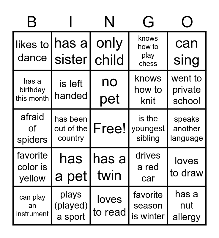 This bingo card has a free space and 24 words: can play an instrument, has a pet, no pet, favorite season is winter, can sing, likes to dance, has a sister, only child, is the youngest sibling, speaks another language, afraid of spiders, is left handed, drives a red car, loves to draw, has a birthday this month, plays (played) a sport, loves to read, knows how to play chess, went to private school, favorite color is yellow, has been out of the country, has a twin, knows how to knit and has a nut allergy.