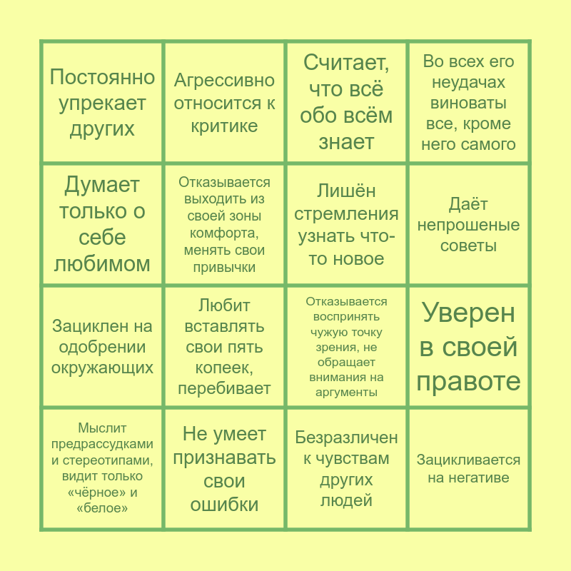 This bingo card has 16 words: Не умеет признавать свои ошибки, Уверен в своей правоте, Считает, что всё обо всём знает, Постоянно упрекает других, Зациклен на одобрении окружающих, Агрессивно относится к критике, Отказывается воспринять чужую точку зрения, не обращает внимания на аргументы, Безразличен к чувствам других людей, Думает только о себе любимом, Отказывается выходить из своей зоны комфорта, менять свои привычки, Мыслит предрассудками и стереотипами, видит только «чёрное» и «белое», Во всех его неудачах виноваты все, кроме него самого, Любит вставлять свои пять копеек, перебивает, Даёт непрошеные советы, Лишён стремления узнать что-то новое and Зацикливается на негативе.
