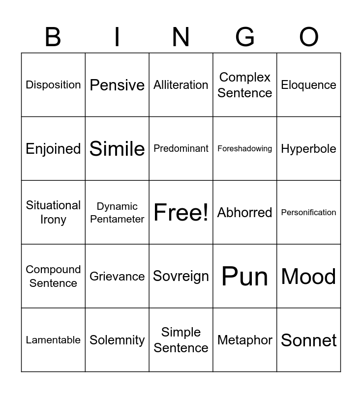 This bingo card has a free space and 24 words: Grievance, Solemnity, Predominant, Lamentable, Eloquence, Disposition, Enjoined, Pensive, Abhorred, Sovreign, Foreshadowing, Situational Irony, Pun, Mood, Simile, Metaphor, Personification, Alliteration, Hyperbole, Dynamic Pentameter, Sonnet, Compound Sentence, Complex Sentence and Simple Sentence.