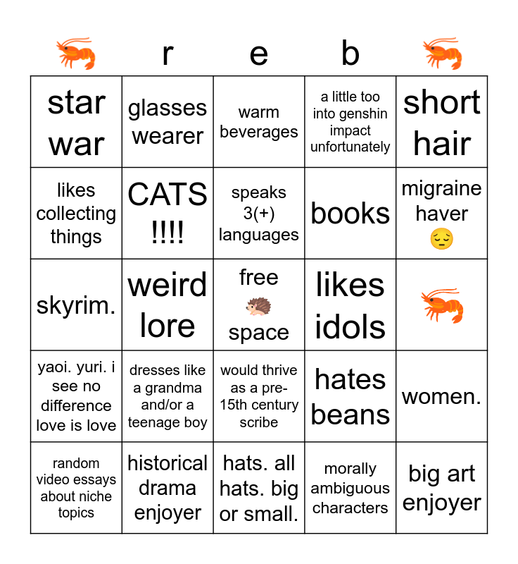 This bingo card has a free space and 24 words: dresses like a grandma and/or a teenage boy, historical drama enjoyer, speaks 3(+) languages, random video essays about niche topics, short hair, star war, likes collecting things, glasses wearer, likes idols, would thrive as a pre-15th century scribe, books, skyrim., hates beans, women., CATS !!!!, morally ambiguous characters, 🦐, warm beverages, migraine haver 😔, weird lore, big art enjoyer, yaoi. yuri. i see no difference love is love, a little too into genshin impact unfortunately and hats. all hats. big or small..