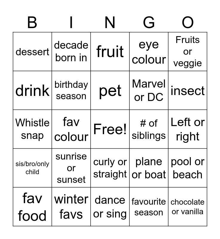 This bingo card has a free space and 24 words: sunrise or sunset, winter favs, pet, fav food, Fruits or veggie, dessert, drink, decade born in, # of siblings, curly or straight, Marvel or DC, Whistle snap, plane or boat, pool or beach, birthday season, favourite season, Left or right, fruit, insect, fav colour, chocolate or vanilla, sis/bro/only child, eye colour and dance or sing.
