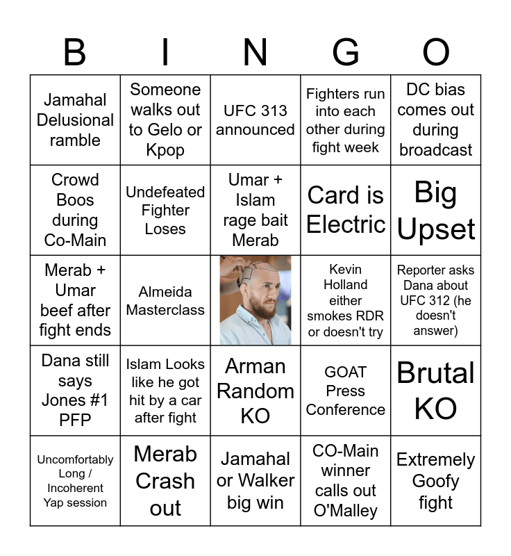 This bingo card has a free space and 24 words: Islam Looks like he got hit by a car after fight, Merab Crash out, Umar + Islam rage bait Merab, Uncomfortably Long / Incoherent Yap session, DC bias comes out during broadcast, Jamahal Delusional ramble, Crowd Boos during Co-Main, Someone walks out to Gelo or Kpop, Kevin Holland either smokes RDR or doesn't try, Arman Random KO, Card is Electric, Merab + Umar beef after fight ends, GOAT Press Conference, Brutal KO, Undefeated Fighter Loses, CO-Main winner calls out O'Malley, Reporter asks Dana about UFC 312 (he doesn't answer), UFC 313 announced, Big Upset, Almeida Masterclass, Extremely Goofy fight, Dana still says Jones #1 PFP, Fighters run into each other during fight week and Jamahal or Walker big win.