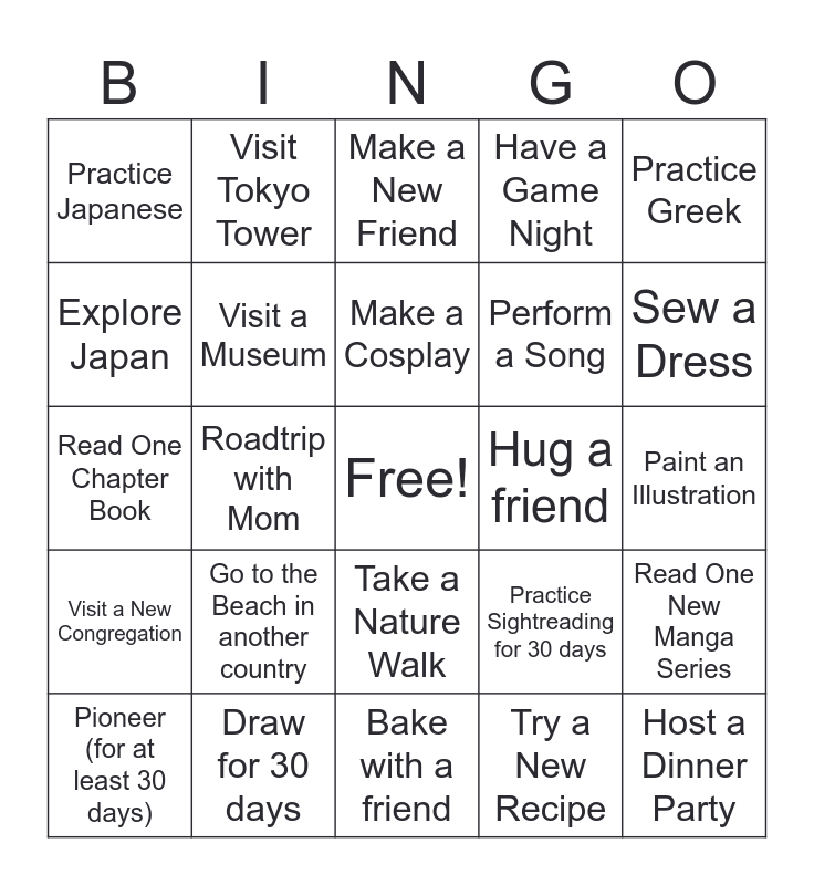 This bingo card has a free space and 26 words: Take a Nature Walk, Try a New Recipe, Make a Cosplay, Draw for 30 days, Practice Greek, Practice Japanese, Explore Japan, Visit Tokyo Tower, Paint an Illustration, Practice Sightreading for 30 days, Perform a Song, Read One Chapter Book, Read One New Manga Series, Pioneer (for at least 30 days), Roadtrip with Mom, Take 12 pictures with Mom, Have a Game Night, Visit a New Congregation, Make a New Friend, Host a Dinner Party, Sew a Dress, Bake with a friend, Hug a friend, Go to the Beach in another country, Visit a Museum and Visit an Aquarium.