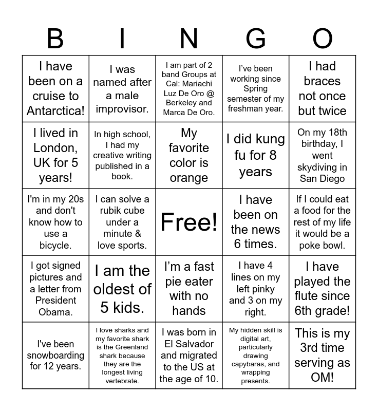 This bingo card has a free space and 44 words: I wish I could go camping and hiking everyday, This is my 3rd time serving as OM!, I've travelled through over 20 states!, I've been snowboarding for 12 years., At age 11, I caught my own pet turtle and brought it back home, but it sadly escaped 3 days later., My hidden skill is digital art, particularly drawing capybaras, and wrapping presents., I am part of 2 band Groups at Cal: Mariachi Luz De Oro @ Berkeley and Marca De Oro., I can play the piano., I had braces not once but twice, I love sharks and my favorite shark is the Greenland shark because they are the longest living vertebrate., I’ve been working since Spring semester of my freshman year., I have been on the news 6 times., I’m a fast pie eater with no hands, I am the oldest of 5 kids., I have three moles on my body exactly on the same places as my mom., I was born in El Salvador and migrated to the US at the age of 10., My birthday was the day that lockdown happened., I'm in my 20s and don't know how to use a bicycle., I love to travel and I am on my 3rd passport book., On my 18th birthday, I went skydiving in San Diego, I was named after a male improvisor., I like whales, I’ve worked a fireworks show, I have been on a cruise to Antarctica!, I went to 15 concerts in one semester., If I could eat a food for the rest of my life it would be a poke bowl., I’ve helped wire and shoot fireworks for the last three Cal football games in Cal Memorial Stadium!, I am an avid collector of lego flowers., I have 4 lines on my left pinky and 3 on my right., I got signed pictures and a letter from President Obama., I met Gordon Ramsey at Disneyland!, I have played the flute since 6th grade!, I cannot swim, I love to paint!, I can solve a rubik cube under a minute & love sports., I can whistle through my teeth, I am pretty good at memorizing birthdays., I do woodcarving in my free time, My favorite color is orange, I lived in London, UK for 5 years!, I did kung fu for 8 years, I currently have a Duolingo streak of 180 days and I'm hoping to make it to a full year., In high school, I had my creative writing published in a book. and My ringtone is hotline bling by Drake!.