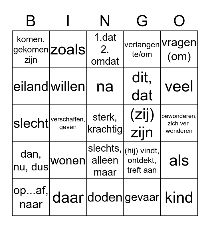 This bingo card has 25 words: wonen, doden, na, op...af, naar, vragen (om), komen, gekomen zijn, eiland, zoals, (zij) zijn, slechts, alleen maar, dit, dat, slecht, (hij) vindt, ontdekt, treft aan, als, willen, kind, bewonderen, zich ver- wonderen, 1.dat 2. omdat, veel, verschaffen, geven, sterk, krachtig, daar, dan, nu, dus, verlangen te/om and gevaar.