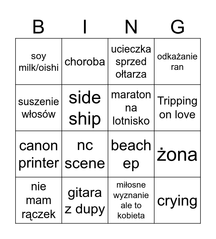 This bingo card has 16 words: gitara z dupy, żona, ucieczka sprzed ołtarza, soy milk/oishi, canon printer, choroba, beach ep, miłosne wyznanie ale to kobieta, suszenie włosów, side ship, nie mam rączek, odkażanie ran, nc scene, Tripping on love, maraton na lotnisko and crying.