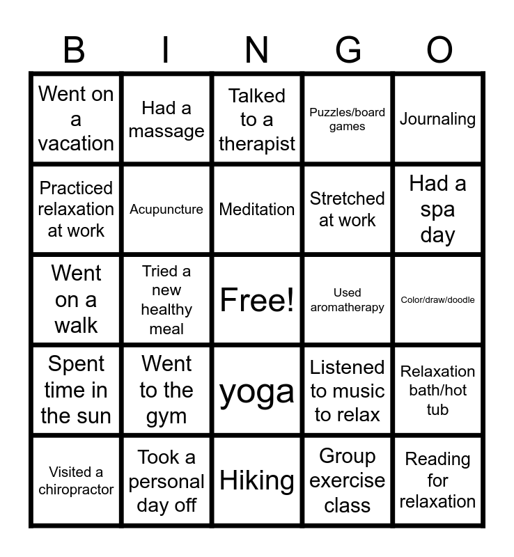This bingo card has a free space and 24 words: Went to the gym, Took a personal day off, Meditation, Visited a chiropractor, Journaling, Went on a vacation, Practiced relaxation at work, Had a massage, Used aromatherapy, yoga, Stretched at work, Went on a walk, Listened to music to relax, Relaxation bath/hot tub, Acupuncture, Group exercise class, Color/draw/doodle, Talked to a therapist, Had a spa day, Tried a new healthy meal, Reading for relaxation, Spent time in the sun, Puzzles/board games and Hiking.