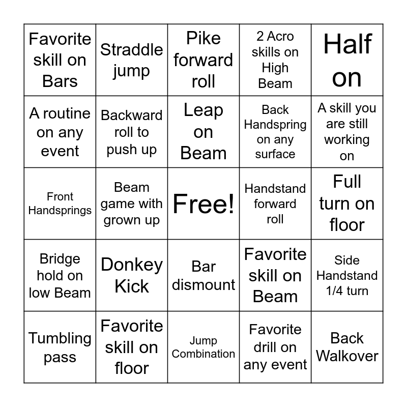 This bingo card has a free space and 24 words: Donkey Kick, Favorite skill on floor, Leap on Beam, Tumbling pass, Half on, Favorite skill on Bars, A routine on any event, Straddle jump, Handstand forward roll, Bar dismount, Back Handspring on any surface, Front Handsprings, Favorite skill on Beam, Side Handstand 1/4 turn, Backward roll to push up, Favorite drill on any event, Full turn on floor, Pike forward roll, A skill you are still working on, Beam game with grown up, Back Walkover, Bridge hold on low Beam, 2 Acro skills on High Beam and Jump Combination.