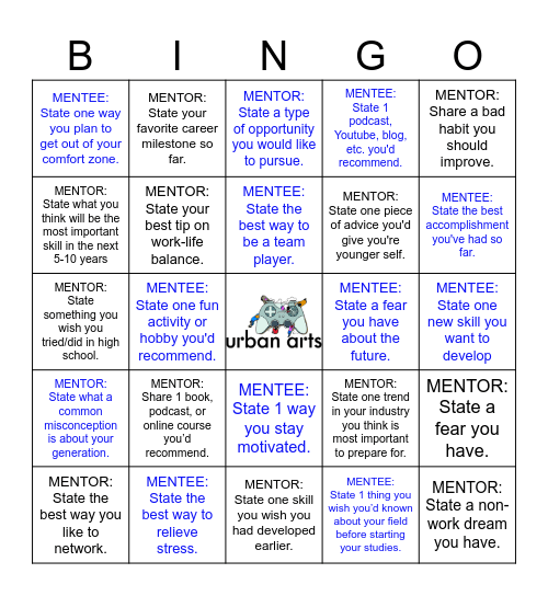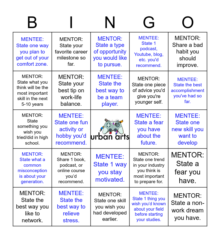 This bingo card has a free space and 24 words: MENTOR: Share 1 book, podcast, or online course you’d recommend., MENTEE: State the best way to relieve stress., MENTEE: State the best way to be a team player., MENTOR: State the best way you like to network., MENTOR: Share a bad habit you should improve., MENTEE: State one way you plan to get out of your comfort zone., MENTOR: State what you think will be the most important skill in the next 5-10 years, MENTOR: State your favorite career milestone so far., MENTEE: State a fear you have about the future., MENTEE: State 1 way you stay motivated., MENTOR: State one piece of advice you'd give you're younger self., MENTOR: State something you wish you tried/did in high school., MENTOR: State one trend in your industry you think is most important to prepare for., MENTOR: State a fear you have., MENTOR: State your best tip on work-life balance., MENTEE: State 1 thing you wish you’d known about your field before starting your studies., MENTEE: State one new skill you want to develop, MENTOR: State a type of opportunity you would like to pursue., MENTEE: State the best accomplishment you've had so far., MENTEE: State one fun activity or hobby you'd recommend., MENTOR: State a non-work dream you have., MENTOR: State what a common misconception is about your generation., MENTEE: State 1 podcast, Youtube, blog, etc. you'd recommend. and MENTOR: State one skill you wish you had developed earlier..