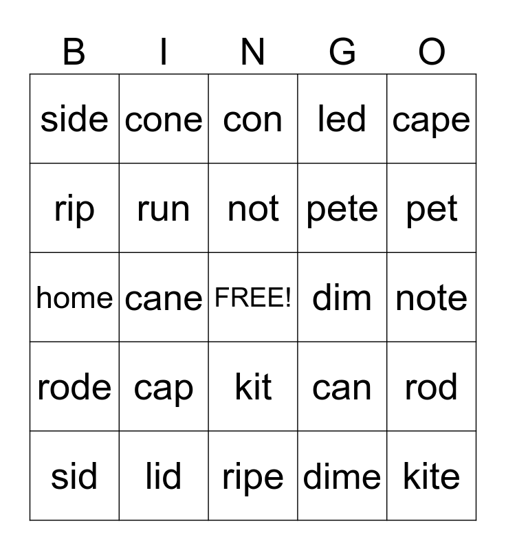 This bingo card has a free space and 24 words: cap, lid, not, sid, cape, side, rip, cone, dim, kit, pete, home, can, rod, run, dime, note, con, pet, cane, kite, rode, led and ripe.
