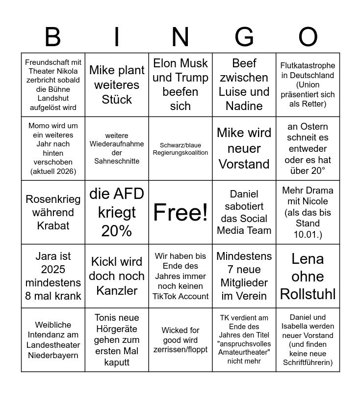 This bingo card has a free space and 24 words: Kickl wird doch noch Kanzler, Tonis neue Hörgeräte gehen zum ersten Mal kaputt, Schwarz/blaue Regierungskoalition, Weibliche Intendanz am Landestheater Niederbayern, Flutkatastrophe in Deutschland (Union präsentiert sich als Retter), Freundschaft mit Theater Nikola zerbricht sobald die Bühne Landshut aufgelöst wird, Momo wird um ein weiteres Jahr nach hinten verschoben (aktuell 2026), Mike plant weiteres Stück, Daniel sabotiert das Social Media Team, Wir haben bis Ende des Jahres immer noch keinen TikTok Account, Mike wird neuer Vorstand, Rosenkrieg während Krabat, Mindestens 7 neue Mitglieder im Verein, Lena ohne Rollstuhl, weitere Wiederaufnahme der Sahneschnitte, TK verdient am Ende des Jahres den Titel "anspruchsvolles Amateurtheater" nicht mehr, Mehr Drama mit Nicole (als das bis Stand 10.01.), Elon Musk und Trump beefen sich, an Ostern schneit es entweder oder es hat über 20°, die AFD kriegt 20%, Daniel und Isabella werden neuer Vorstand (und finden keine neue Schriftführerin), Jara ist 2025 mindestens 8 mal krank, Beef zwischen Luise und Nadine and Wicked for good wird zerrissen/floppt.