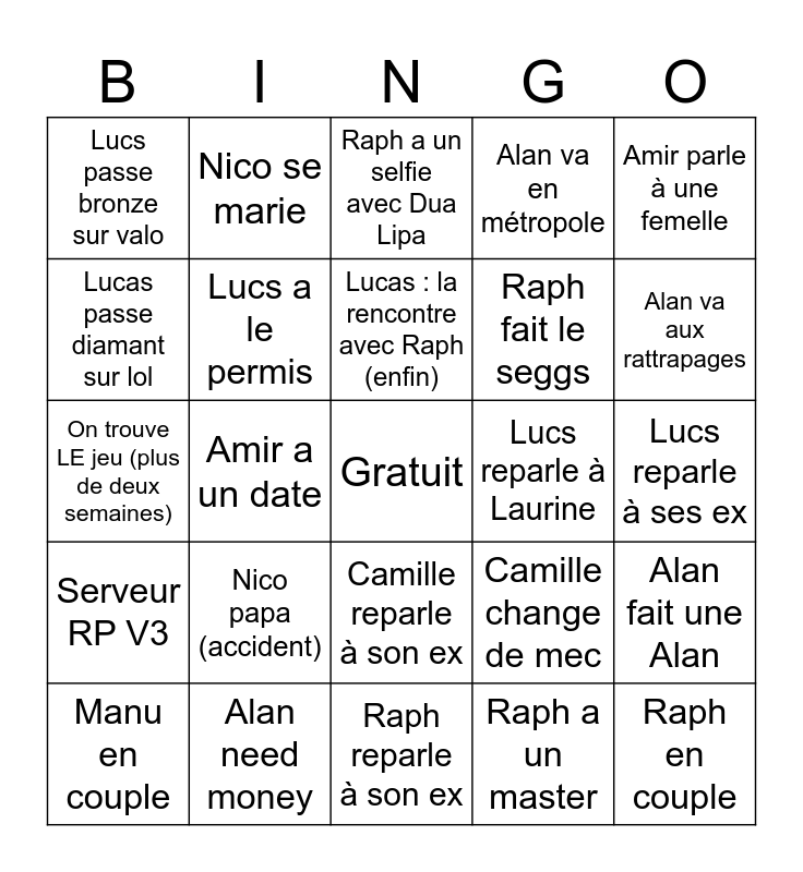 This bingo card has a free space and 24 words: Nico papa (accident), Alan need money, Lucas : la rencontre avec Raph (enfin), Manu en couple, Amir parle à une femelle, Lucs passe bronze sur valo, Lucas passe diamant sur lol, Nico se marie, Lucs reparle à Laurine, Camille reparle à son ex, Raph fait le seggs, On trouve LE jeu (plus de deux semaines), Camille change de mec, Alan fait une Alan, Lucs a le permis, Raph a un master, Lucs reparle à ses ex, Raph a un selfie avec Dua Lipa, Alan va aux rattrapages, Amir a un date, Raph en couple, Serveur RP V3, Alan va en métropole and Raph reparle à son ex.