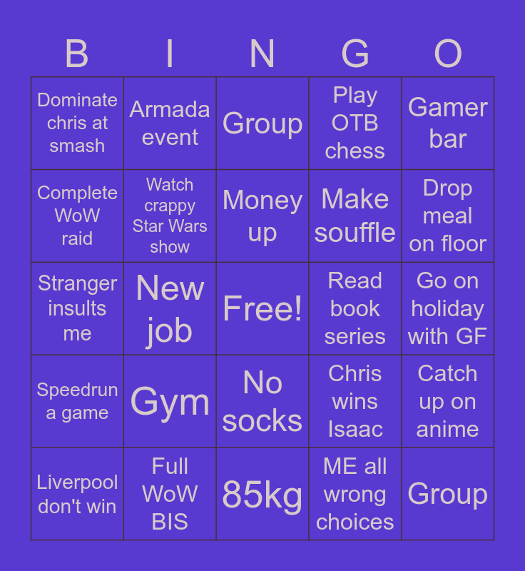 This bingo card has a free space and 25 words: Gym, 85kg, Money up, Liverpool don't win, Gamer bar, Dominate chris at smash, Complete WoW raid, Armada event, Read book series, No socks, Make souffle, Stranger insults me, Chris wins Isaac, Catch up on anime, Watch crappy Star Wars show, Wtach 5 old films, Go on holiday with GF, Group, Drop meal on floor, New job, Group, Full WoW BIS, Speedrun a game, Play OTB chess and ME all wrong choices.