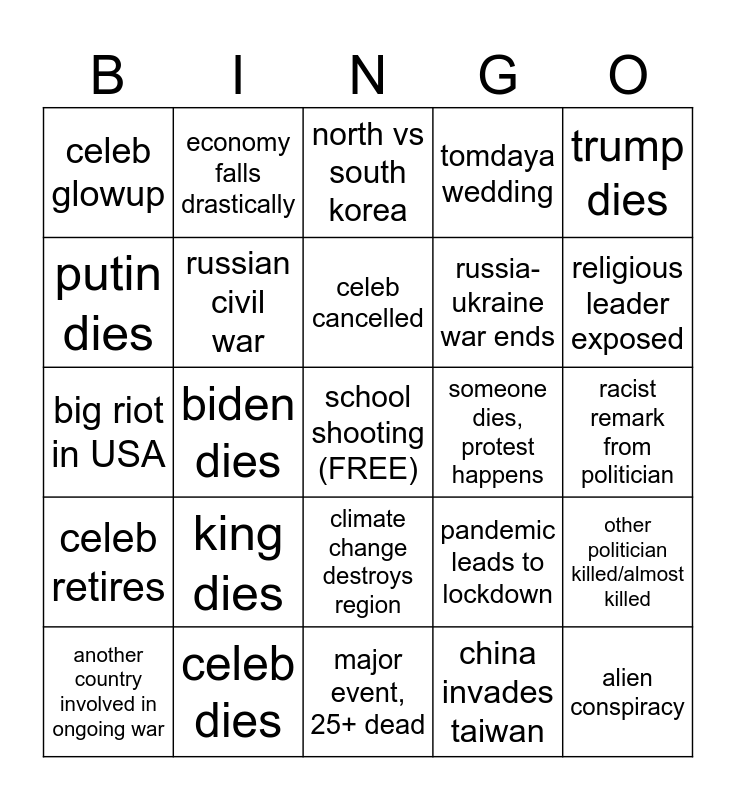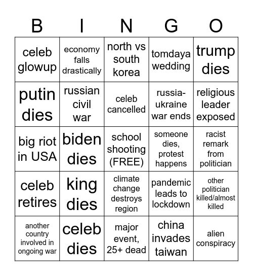 This bingo card has a free space and 24 words: king dies, celeb dies, celeb cancelled, another country involved in ongoing war, trump dies, celeb glowup, putin dies, economy falls drastically, someone dies, protest happens, climate change destroys region, russia-ukraine war ends, big riot in USA, pandemic leads to lockdown, other politician killed/almost killed, russian civil war, china invades taiwan, racist remark from politician, north vs south korea, religious leader exposed, biden dies, alien conspiracy, celeb retires, tomdaya wedding and major event, 25+ dead.