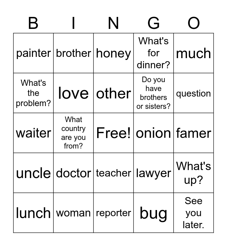 This bingo card has a free space and 34 words: cup, bug, cut, rug, uncle, love, much, lunch, brother, understand, other, honey, chicken, banana, onion, question, woman, waiter, doctor, lawyer, teacher, actor, painter, famer, reporter, See you later., What's for dinner?, Do you know the answer?, Do you have brothers or sisters?, What's the problem?, Can you say that again?, What country are you from?, What's up? and That was fun!.