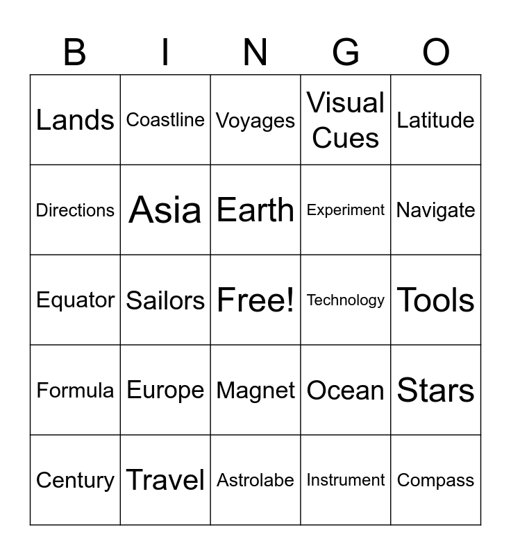 This bingo card has a free space and 29 words: Century, Explore, Sailors, Stories, Lands, Voyages, Asia, Europe, Technology, Travel, Tools, Compass, Astrolabe, Instrument, Navigate, Measure, Magnet, Formula, Latitude, Equator, Ocean, Accurate, Experiment, Directions, Visual Cues, Coastline, Stars, Earth and North.
