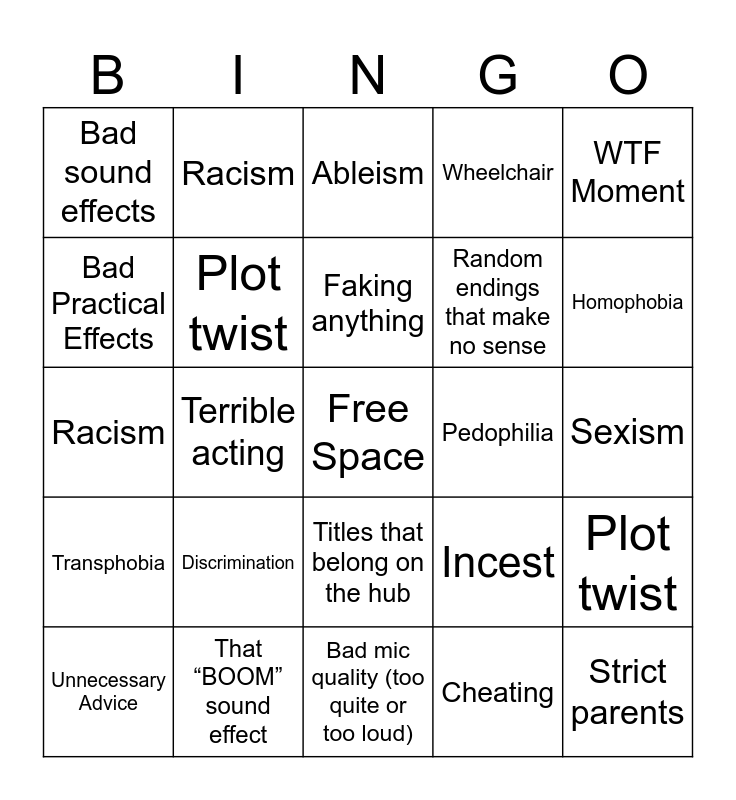 This bingo card has a free space and 29 words: Unnecessary Advice, Slurs, Terrible acting, Violence, Bad sound effects, Ableism, Plot twist, Discrimination, Pedophilia, That “BOOM” sound effect, Sexism, Strict parents, Bad mic quality (too quite or too loud), Cheating, Homophobia, That one psycho character, Titles that belong on the hub, Transphobia, WTF Moment, Racism, Incest, Scenes that belong on the hub, Random endings that make no sense, Bad Practical Effects, Wheelchair, Racism, Plot twist, Faking anything and Plot that doesn't relate to the title.
