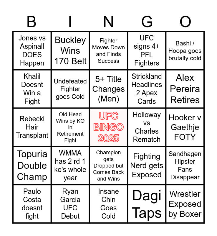 This bingo card has a free space and 24 words: WMMA has 2 rd 1 ko's whole year, Ryan Garcia UFC Debut, 5+ Title Changes (Men), Paulo Costa doesnt fight, Bashi / Hoopa goes brutally cold, Jones vs Aspinall DOES Happen, Khalil Doesnt Win a Fight, Buckley Wins 170 Belt, Holloway vs Charles Rematch, Champion gets Dropped but Comes Back and Wins, Strickland Headlines 2 Apex Cards, Rebecki Hair Transplant, Fighting Nerd gets Exposed, Sandhagen Hipster Fans Disappear, Undefeated Fighter goes Cold, Dagi Taps, Hooker v Gaethje FOTY, Fighter Moves Down and Finds Success, Alex Pereira Retires, Old Head Wins by KO in Retirement Fight, Wrestler Exposed by Boxer, Topuria Double Champ, UFC signs 4+ PFL Fighters and Insane Chin Goes Cold.
