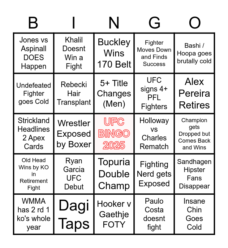 This bingo card has a free space and 24 words: WMMA has 2 rd 1 ko's whole year, Ryan Garcia UFC Debut, 5+ Title Changes (Men), Paulo Costa doesnt fight, Bashi / Hoopa goes brutally cold, Jones vs Aspinall DOES Happen, Khalil Doesnt Win a Fight, Buckley Wins 170 Belt, Holloway vs Charles Rematch, Champion gets Dropped but Comes Back and Wins, Strickland Headlines 2 Apex Cards, Rebecki Hair Transplant, Fighting Nerd gets Exposed, Sandhagen Hipster Fans Disappear, Undefeated Fighter goes Cold, Dagi Taps, Hooker v Gaethje FOTY, Fighter Moves Down and Finds Success, Alex Pereira Retires, Old Head Wins by KO in Retirement Fight, Wrestler Exposed by Boxer, Topuria Double Champ, UFC signs 4+ PFL Fighters and Insane Chin Goes Cold.