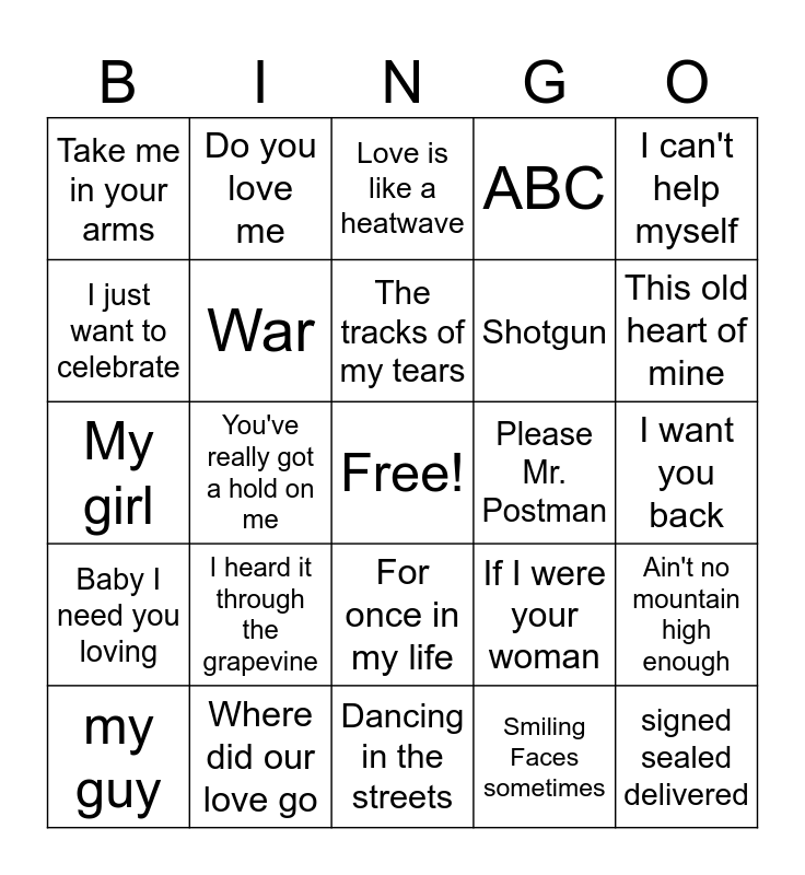This bingo card has a free space and 24 words: I heard it through the grapevine, Where did our love go, The tracks of my tears, my guy, I can't help myself, Take me in your arms, I just want to celebrate, Do you love me, Please Mr. Postman, For once in my life, Shotgun, My girl, If I were your woman, Ain't no mountain high enough, War, Smiling Faces sometimes, I want you back, Love is like a heatwave, This old heart of mine, You've really got a hold on me, signed sealed delivered, Baby I need you loving, ABC and Dancing in the streets.