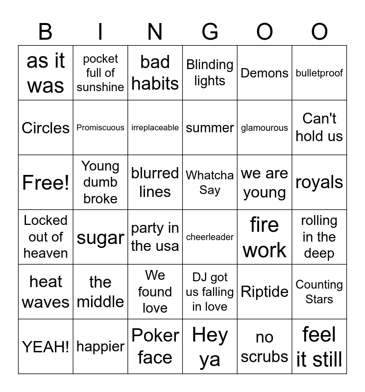 This bingo card has 36 words: DJ got us falling in love, We found love, Hey ya, Circles, Locked out of heaven, Whatcha Say, Promiscuous, Poker face, Demons, Riptide, Can't hold us, Blinding lights, Counting Stars, Young dumb broke, summer, as it was, heat waves, we are young, Free!, bad habits, blurred lines, sugar, cheerleader, party in the usa, fire work, pocket full of sunshine, glamourous, happier, irreplaceable, bulletproof, feel it still, YEAH!, rolling in the deep, royals, the middle and no scrubs.