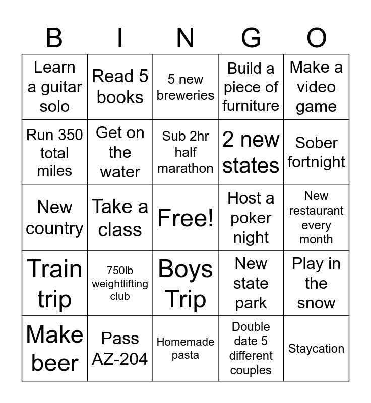 This bingo card has a free space and 24 words: 750lb weightlifting club, Pass AZ-204, Sub 2hr half marathon, Make beer, Make a video game, Learn a guitar solo, Run 350 total miles, Read 5 books, Host a poker night, Boys Trip, 2 new states, New country, New state park, Play in the snow, Get on the water, Double date 5 different couples, New restaurant every month, 5 new breweries, Sober fortnight, Take a class, Staycation, Train trip, Build a piece of furniture and Homemade pasta.