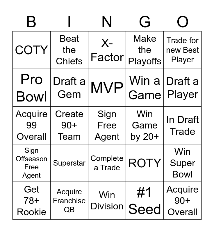 This bingo card has a free space and 24 words: Superstar, Acquire Franchise QB, MVP, Get 78+ Rookie, Trade for new Best Player, COTY, Pro Bowl, Beat the Chiefs, Win Game by 20+, Complete a Trade, Win a Game, Acquire 99 Overall, ROTY, Win Super Bowl, Draft a Gem, #1 Seed, In Draft Trade, X-Factor, Draft a Player, Create 90+ Team, Acquire 90+ Overall, Sign Offseason Free Agent, Make the Playoffs and Win Division.