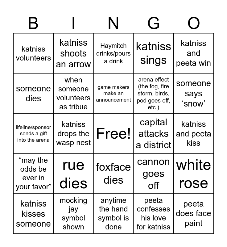 This bingo card has a free space and 27 words: cannon goes off, ‘girl on fire’, arena effect (the fog, fire storm, birds, pod goes off, etc.), anytime the hand symbol is done, someone dies, Haymitch drinks/pours a drink, katniss shoots an arrow, “may the odds be ever in your favor”, capital attacks a district, white rose, lifeline/sponsor sends a gift into the arena, katniss sings, katniss kisses someone, mocking jay symbol shown, someone says ‘snow’, haymitch says something sarcastic, when someone volunteers as tribue, game makers make an announcement, rue dies, katniss volunteers, katniss and peeta kiss, peeta confesses his love for katniss, katniss drops the wasp nest, peeta does face paint, foxface dies, katniss and peeta win and katniss shoots the pig’s apple.