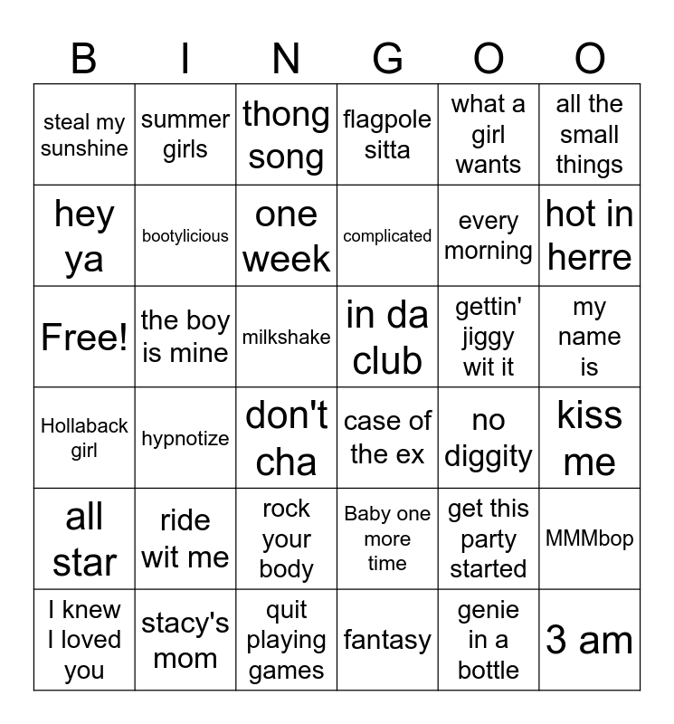 This bingo card has 36 words: Baby one more time, rock your body, fantasy, hey ya, Hollaback girl, in da club, bootylicious, quit playing games, what a girl wants, get this party started, hot in herre, flagpole sitta, MMMbop, the boy is mine, complicated, steal my sunshine, all star, gettin' jiggy wit it, Free!, thong song, milkshake, hypnotize, case of the ex, don't cha, no diggity, summer girls, every morning, stacy's mom, one week, all the small things, 3 am, I knew I loved you, kiss me, my name is, ride wit me and genie in a bottle.