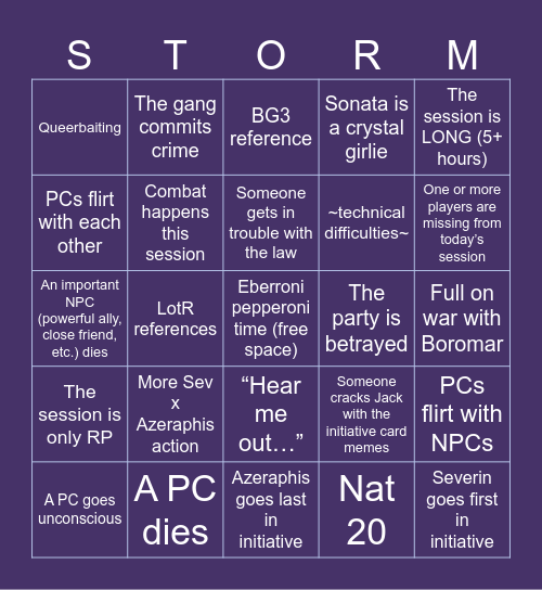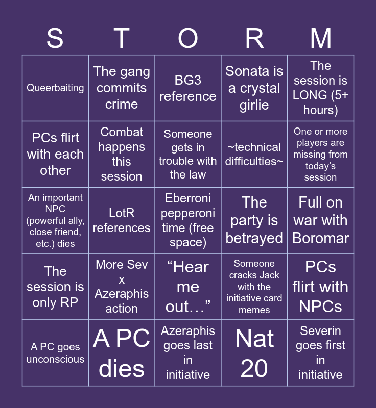 This bingo card has a free space and 33 words: The Patreon names break Jacob, 8EER-8OT survives the session, LotR references, Queen Emma is here to save the stream, The session is only RP, Combat happens this session, The session is LONG (5+ hours), A PC goes unconscious, The gang commits crime, More BlinkysTM, Someone gets in trouble with the law, BG3 reference, Someone crits, The party betrays someone, The party is betrayed, One or more players are missing from today’s session, A PC dies, An important NPC (powerful ally, close friend, etc.) dies, More Sev x Azeraphis action, Someone cracks Jack with the initiative card memes, “Hear me out…”, Something a player says causes reactions off-camera, Queerbaiting, Full on war with Boromar, Azeraphis goes last in initiative, Severin goes first in initiative, Sonata is a crystal girlie, ~technical difficulties~, PCs flirt with each other, PCs flirt with NPCs, Nat 1, Nat 20 and Session ends on a cliffhanger.