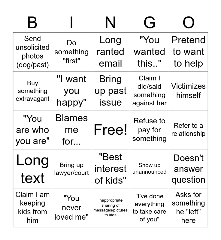 This bingo card has a free space and 24 words: Bring up lawyer/court, "You never loved me", Bring up past issue, Claim I am keeping kids from him, Pretend to want to help, Send unsolicited photos (dog/past), Buy something extravagant, Do something "first", Refuse to pay for something, "Best interest of kids", Claim I did/said something against her, "You are who you are", Show up unannounced, Doesn't answer question, "I want you happy", "I've done everything to take care of you", Refer to a relationship, Long ranted email, Victimizes himself, Blames me for..., Asks for something he "left" here, Long text, "You wanted this.." and Inappropriate sharing of messages/pictures to kids.