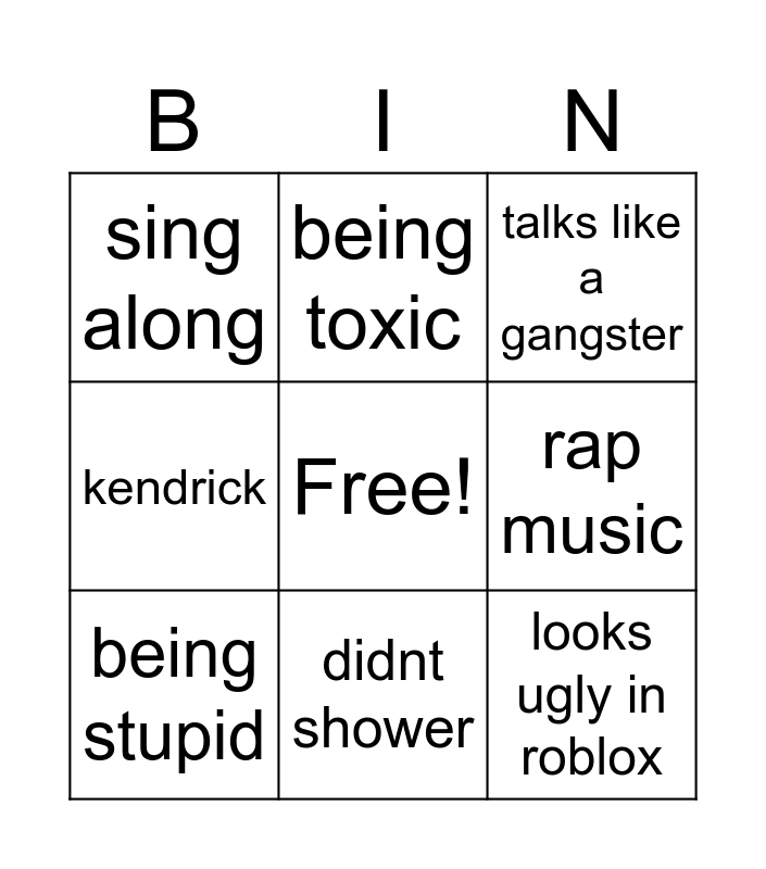 This bingo card has a free space and 8 words: rap music, talks like a gangster, being toxic, being stupid, sing along, looks ugly in roblox, kendrick and didnt shower.